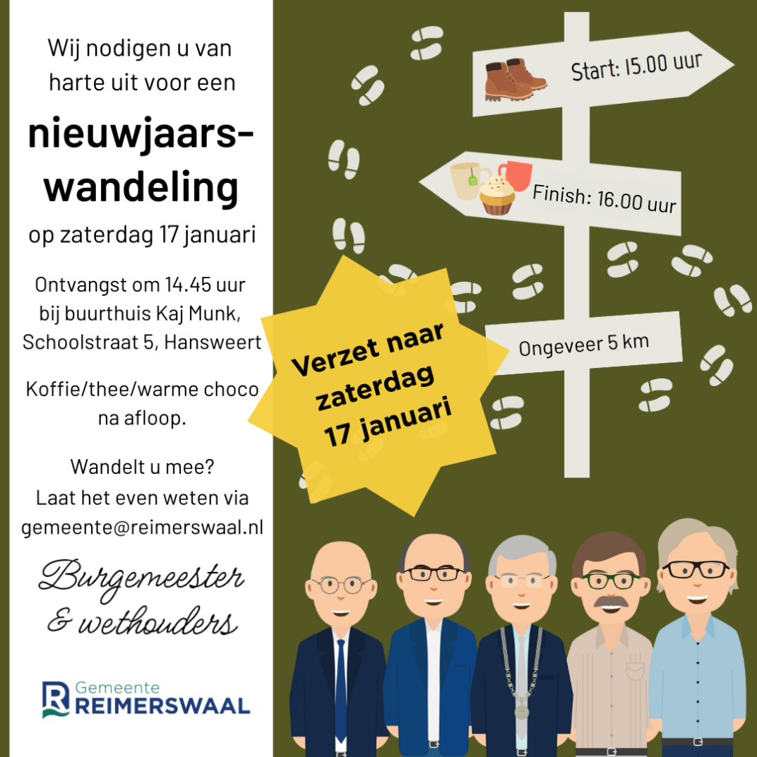 Het college van burgemeester en wethouders en kinderburgemeester Ralph nodigen u uit voor een nieuwjaarswandeling op zaterdag 17 januari.