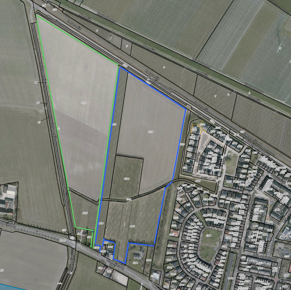 - Eén perceel aan de oostkant van Krabbendijke aan de Meiboom (zie afbeelding hieronder;